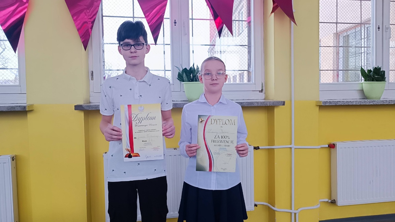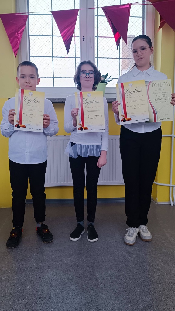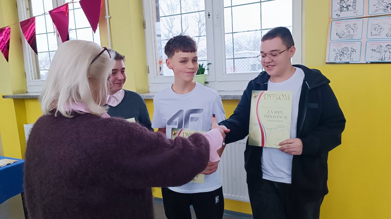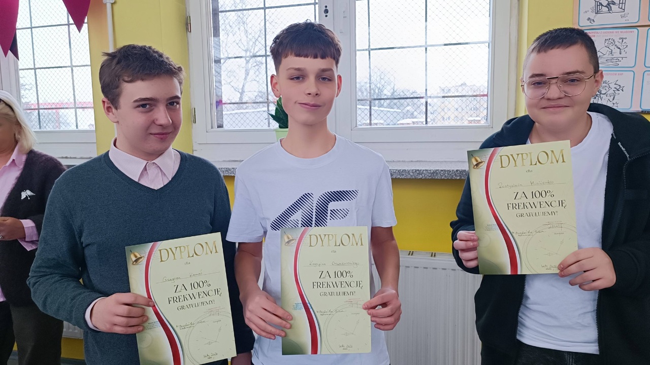 Z dumą podkreślono także uczniów, którzy mogą poszczycić się 100% frekwencją – ich wytrwałość, obowiązkowość i konsekwencja zasługują na najwyższe uznanie.