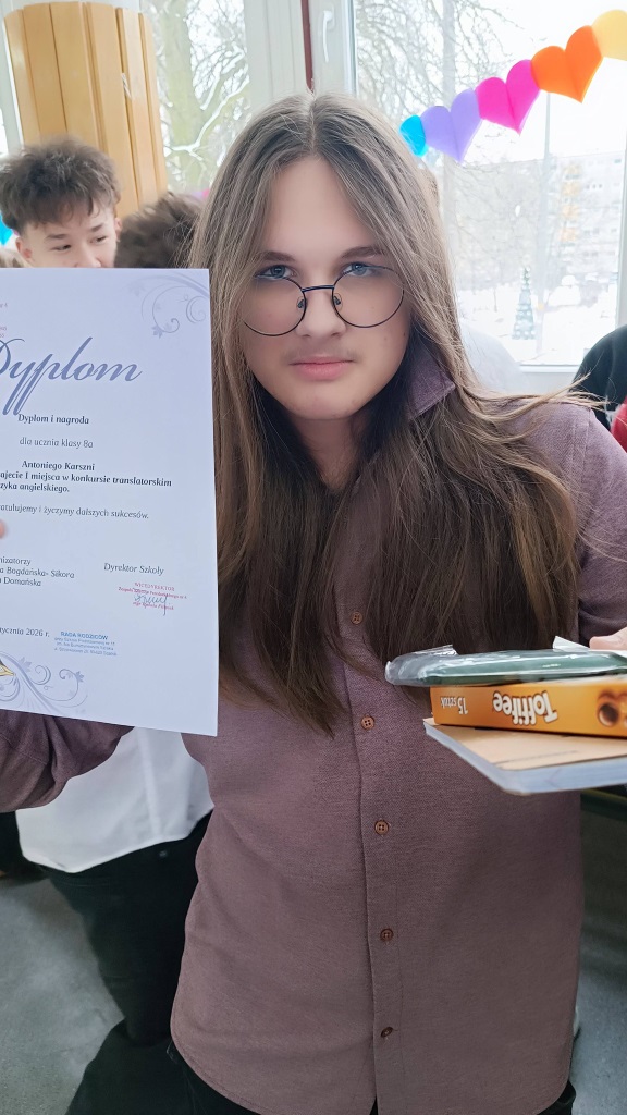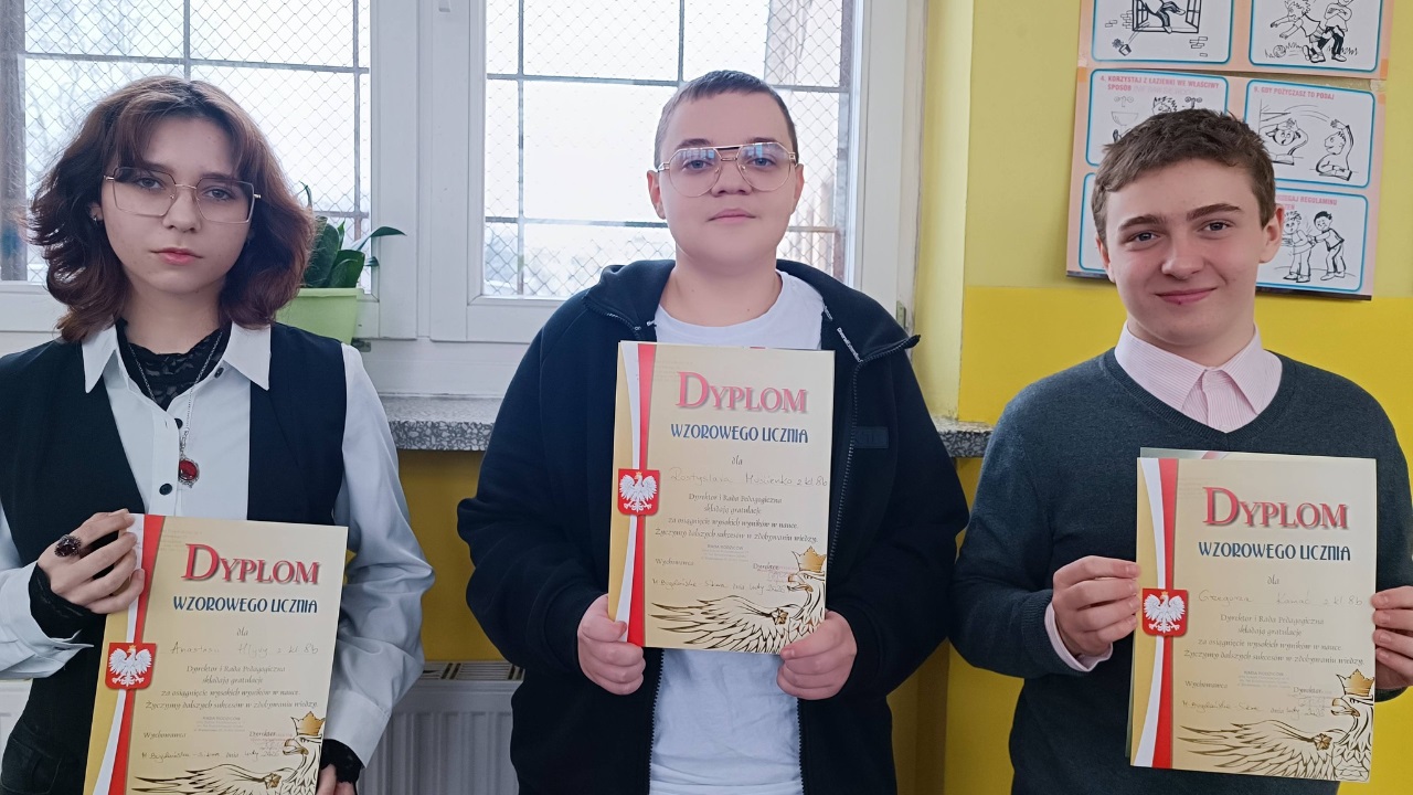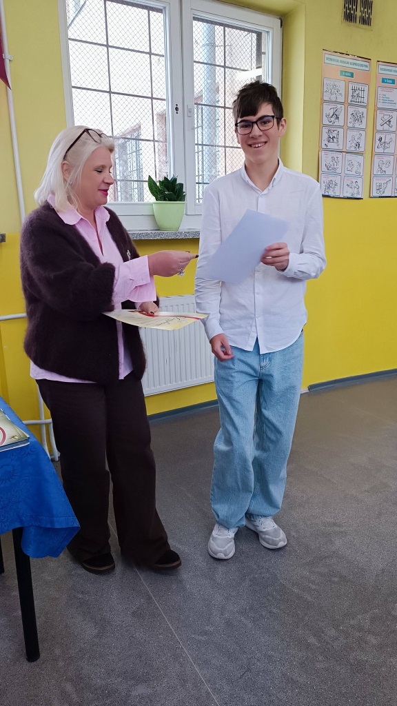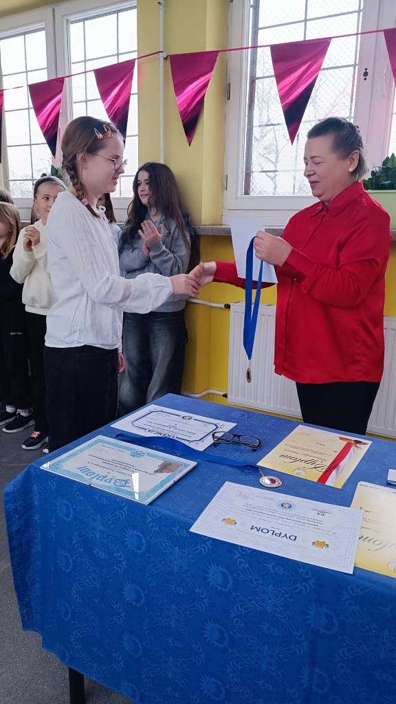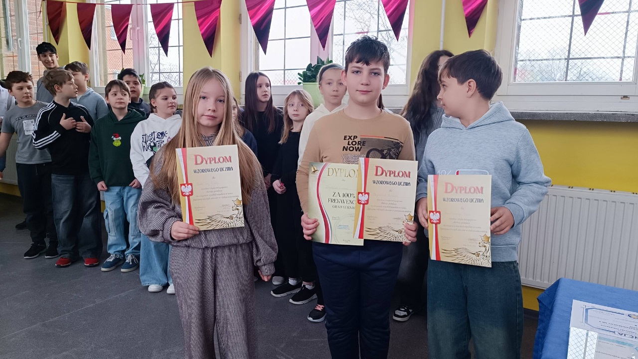 Podczas spotkania wręczono nagrody laureatom konkursów językowych, zespołowych i matematycznych, doceniając ich wiedzę, systematyczność oraz pasję rozwijania swoich zainteresowań. Szczególne gratulacje skierowano również do uczniów wzorowych, którym wręczono dyplomy uznania za bardzo dobre wyniki w nauce, nienaganną postawę oraz zaangażowanie w życie szkoły.