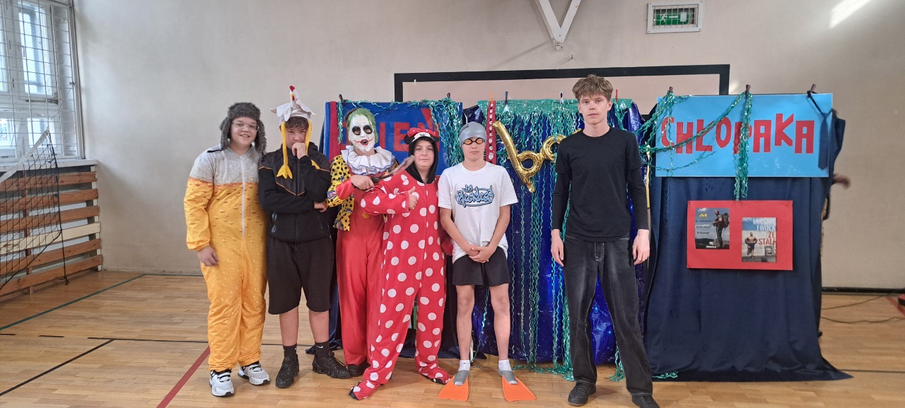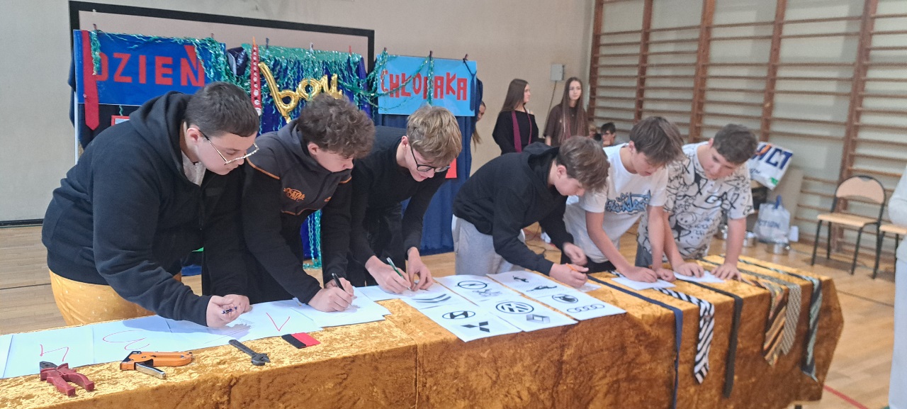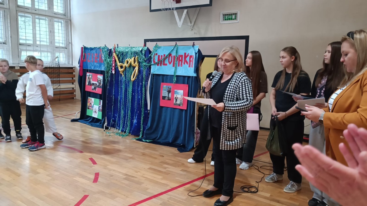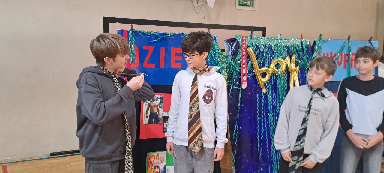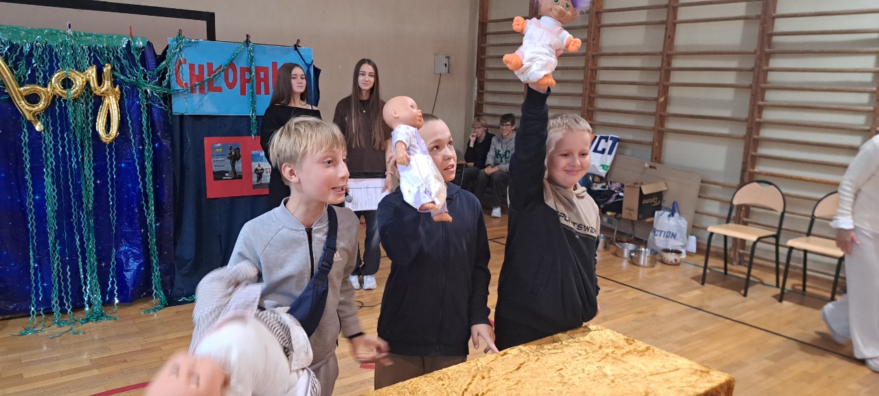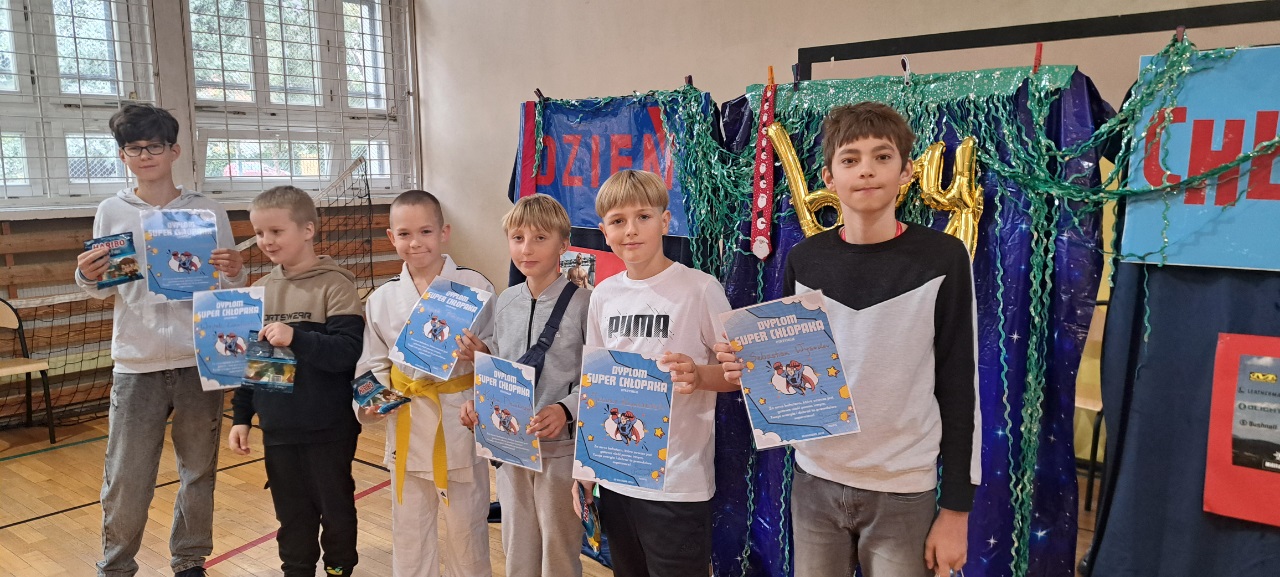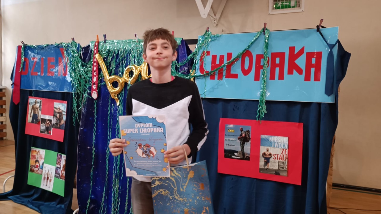 Samorząd Uczniowski przygotował dziś ogromną niespodziankę z okazji Dnia Chłopaka-wybory Super Chłopaka. Odbyły się one w sali gimnastycznej na dwóch poziomach-klas 4-6 oraz klas 7-8. Na śmiałków z każdej klasy czekały ciekawe i wymagające zadania np. wiązanie krawata, zmiana pieluszki czy wybór składników do dań takich jak pierogi, naleśniki czy bigos. Kandydaci na Super Chłopaka musieli się wykazać wiedzą o narzędziach, kosmetykach czy nawet wiedzą o Polsce. Dodatkowo chłopcy z klas 7-8 przygotowali pokaz mody połączony z pokazem talentów. Wybrano dwóch Super Chłopców-Sebastiana z klasy 6 oraz Olka z klasy 8 ale nie mamy żadnych wątpliwości-wszyscy kandydaci byli SUPER!